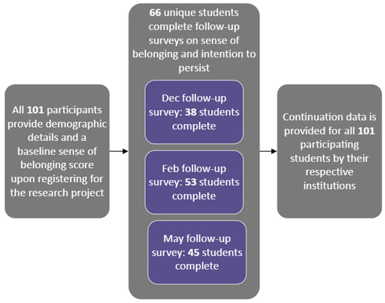 As part of an overarching study on student belonging, 101 participants have been included within the quantitative longitudinal analyses of survey data for this article because they provided baseline measurements for their sense of belonging, and continuation data were able to be provided for them from their respective institutions. Further, 66 of these 101 students also participated in at least one follow-up measurement activity of their sense of belonging and provided reflections on their intention to persist. A visualisation of the different stages of data collection is presented in Figure 1.