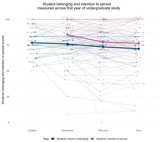 Given that they were measured by separate scales, little focus should be given to the fact that intention to persist was consistently greater than students’ sense of belonging at all measurement points. Whilst, the questions in each scale were devised using the same Likert scale—from strongly disagree to strongly agree—they are different scales. Instead of focusing solely on absolute values, instead more insight can be gained by exploring changes over time. Through this lens, it is clear that both students’ sense of belonging and intention to persist decreased slightly on average through the first academic year of study.