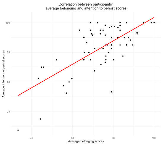 Given that belonging and intention to persist were strongly correlated within each survey measurement point, it perhaps could be expected that the relationship between the average values for these two constructs would be similarly high. In fact, the average sense of belonging was almost a perfect predictor of students’ average intention to persist (β = 0.989, p < 0.001, n = 66).