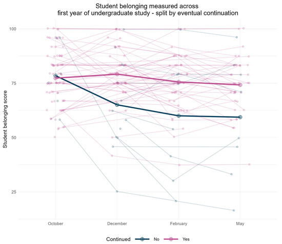 Plot showing students’ sense of belonging across the first year of undergraduate study—split by students’ continuation status.