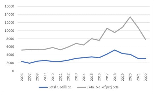 Figure 1—noting 2005 and 2023 as incomplete years and thus excluding them from this representation) was GBP55,202 million; and the total number of projects awarded during the period was 131,331. This gives an annual average of GBP2905 million in funding awarded for an average number of 6912 funded projects. The year 2018 had the highest amount of annual funding at GBP5221 million. The official launch of UKRI in April 2018 may be related to the surge in funding this year. The highest number of projects (13,439) were awarded in the year 2020. This rise in the number of projects could be due to the COVID-19 pandemic, which prompted governments worldwide to support many projects on different areas of research relating to the crisis. An average of GBP420,330 has been awarded per project, but this is across a very broad range of funding awards, with the highest single application receiving GBP652.1 million (High-Value Manufacturing Catapult project) and 435 other projects receiving GBP10 million or more.