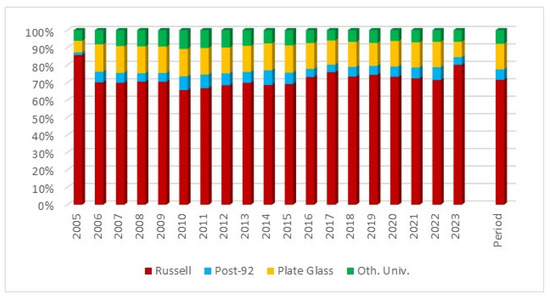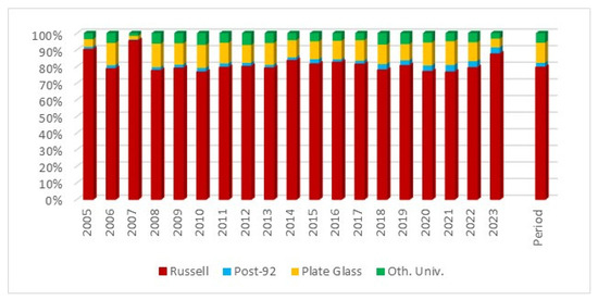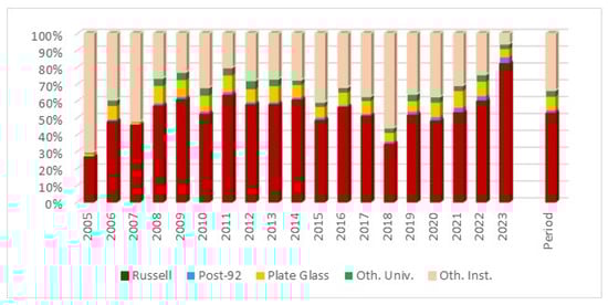 Figure 5), the disparity in funding allocation is even more apparent. UKRI has allocated a funding amount of GBP36,548 million to a total number of 100,338 projects to Universities in the UK from 2005–2023. Of that, Russell Group universities received 79% of total funding compared to 12% funding allocated to Plate Glass universities, 6% to Other universities, and only 3% to the Post-92 universities. In terms of number of projects, the analysis highlights a similar dominance by Russell group universities; they have been awarded 71% of the funded projects over the period considered, whilst the Plate Glass group was awarded 15% of projects, Other universities 8% of projects, and with just 6% of total funded projects going to Post-92 Universities. These percentages suggest that Post-92 universities may be receiving numerous small grant projects but may be failing in obtaining large grants.