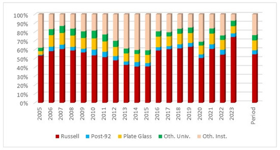 n = 78), representing 50.3% of all funded universities in the UK, received the lowest amount of funding over the period analysed, with GBP969 million (2% of total funding) for 5982 projects (4% of total projects). These figures are striking, especially considering that 16 out of the 20 least socially inclusive universities belong to the Russell Group (The Times, 2024), with around 67% of its members accounting for 80% of the positions that highlight shortcomings in their EDI strategies. Due to the ambiguity surrounding the membership and fluctuating numbers of the ‘other RKE institutions’, they were excluded from further analysis (in some instances). When focusing only on university groups (