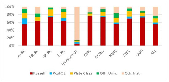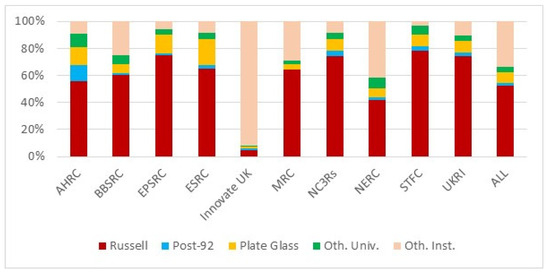 Figure 3). The second largest group receiving UKRI funding is the ‘Other RKE Institutions’ group, awarded a total of GBP18,654 million (33% of total funding) for 30,940 projects (24% of total projects). The Plate Glass group of universities received GBP4439 million (8% of total funding) across 14,720 projects (11% of total projects). In fourth place is the Other universities group, which received GBP2213 million (4% of total funding) for 7794 projects (6% of total projects). The Post-92 group, despite being the group with the largest number of universities (