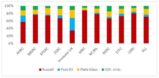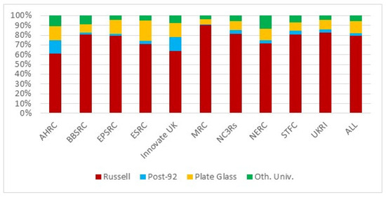 20]. As useful as this analysis is, what it does not identify is whether the diversity of successful applications is coming from a wide range of universities. Instead, it implies that a high-status university is less likely to receive further funding if it has already secured over 10% of the total funding (within the same round of funding). In such cases, another high-status university may be the next recipient. This pattern appears to be particularly true for the “most prestigious funding,” which tends to “flow” predominantly to Russell Group universities [