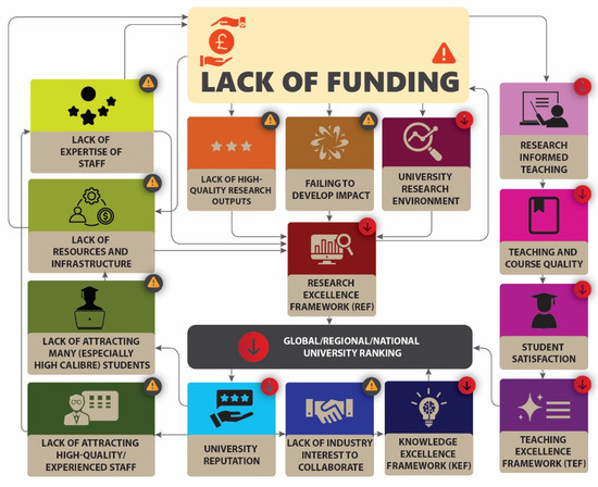 There are a number of other challenges in not attracting sufficient research funding: in engaging in or conducting impactful research (one of the criteria for REF assessment); in producing high quality outputs that have a significant knowledge contribution (another criteria for REF assessment); and in recruiting and retaining high-calibre academics/researchers, which will impact on research environment (another criteria for REF assessment). Less funding leads to issues for teaching quality, resources, and overall student experience (criteria in Guardian rankings). In underfunded institutions, there is a diminishing visibility of academics and consequently, the overall reputation of the university falls. This will also lead to reduced interdisciplinary collaborations, international partnerships and as a result, reducing the university’s ability to engage in research at a global scale (which impacts on QS or THE rankings). There will be a lack of investment in research infrastructure and facilities, which can hinder the ability to perform cutting-edge research. Similarly, a lack of funding will hinder a university’s ability to engage in knowledge transfer activities and contribute to innovation.