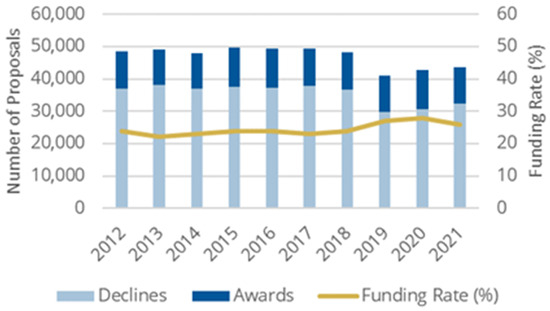 This external grant funding provides a plethora of research resources and professional development opportunities for faculty and doctoral students. Competition for this funding has become increasingly heightened over time. As illustrated in Figure 1 and Figure 2, there has been a decline in the rate of successfully funded proposals from major US funders such as the National Institutes of Health (NIH) and the National Science Foundation (NSF) compared to twenty years ago. There was an apparent surge in grant applications in 2021 to both NIH and NSF, reducing the funding rate due to increased numbers of competitive proposals. The number of submitted proposals has gradually decreased since then; however, competition remains relatively high.