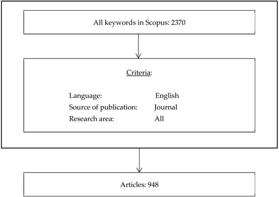 This study focused on journal articles related to digitization, education, and research methodologies, with the results filtered based on their relevance to the objectives pursued. In the first stage, a total of 2370 journals were evaluated; however, after applying inclusion criteria—such as publication of articles exclusively in English and in scholarly journals—the sample was limited to 948 journals, ensuring the quality and thematic accuracy of the selected sources. This process is presented in Figure 1.
