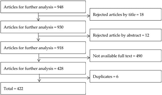 In the systematic literature review, we followed the standards of Webster and Watson (2002) to reject an article [16]. We then evaluated the titles of 948 articles and, after reading their abstracts, we accepted 918. Further studies were rejected because their full text was not accessible. After the filtering process, 422 articles were included in the final phase of our search. The identification of this critical mass of relevant publications is illustrated in Figure 2.