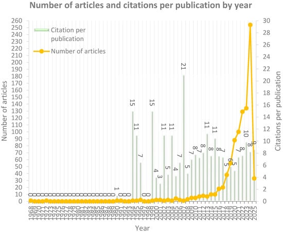The results of our research date from 1968 to February 2025. No articles were published in the periods 1969–1971, 1973–1989, 1992–1993, and 1997–1998. On the contrary, from 2014 onwards, an increasing trend in digital teaching methods was observed. Figure 3 depicts the annual number of published articles in combination with the annual number of citations. Fluctuations can be observed in the reports from 1994 to February 2025.