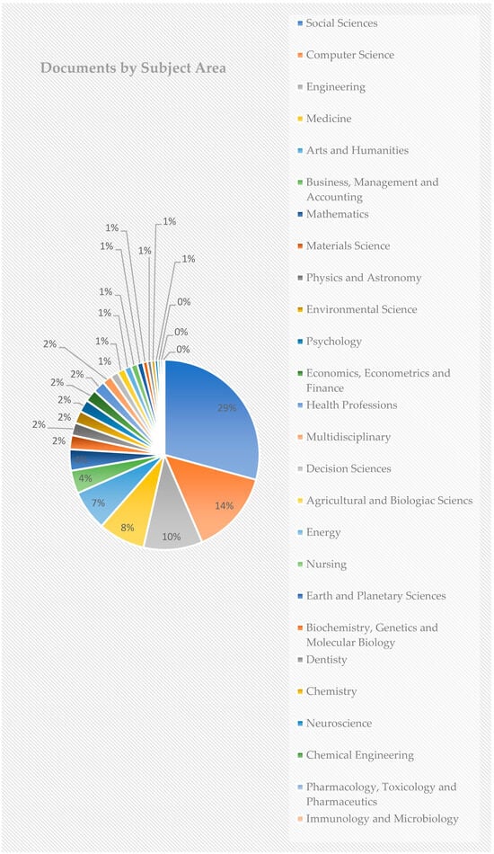 Figure 4 shows the articles by thematic category to which they belong. The thematic area of “Social Sciences” holds 29%, followed by “Computer Sciences” with 14%. The high percentages in these two categories indicate the significant research activity of digital education methods and the growing interest of the scientific community in these areas. The combined dominance of these two thematic categories may also indicate the convergence of social research with technological developments, since artificial intelligence, data analysis, and the impact of digital media are critical issues for the modern era.