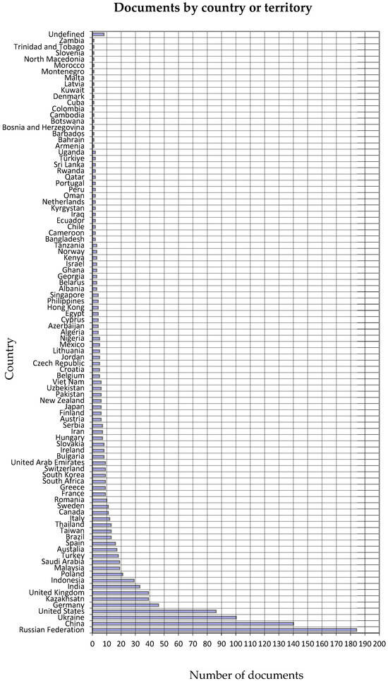 Russia leads with 184 publications, confirming its position as a central hub in this research. China follows with 140 publications, while Ukraine is in third place with 100 publications. In fourth place is the United States of America with 86 publications, while Germany ranks fifth with 46 publications. Then follows Kazakhstan, with 39 publications and other countries with fewer contributions. However, some countries have published only one article, which suggests new emerging trends or specialized contributions to the field.