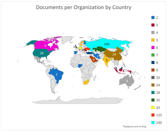 From the results of the previous Table 3, Figure 6 emerges, which depicts on a world map by country the number of total articles, for all organizations based in each country. That is, the sum of the publications of all organizations of a country creates the final result in this image. The first place with a number of 240 publications is held by Russia, while Ukraine follows with 133 publications. Germany is next with 43 publications, followed by Kazakhstan with 35. Other countries such as the United States of America, China, the United Kingdom, Saudi Arabia, etc., follow with a smaller number of publications. At the base, with just two publications per country in all organizations, are Brazil, Finland, Iran, Nigeria, and Spain. Meanwhile, there are also several countries with zero publications by their organizations regarding digital education methods.