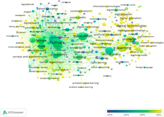 - The red area is related to education and digital technologies, including keywords such as “e-learning”, “students”, “digital technologies”, “virtual reality”, and “artificial intelligence”.