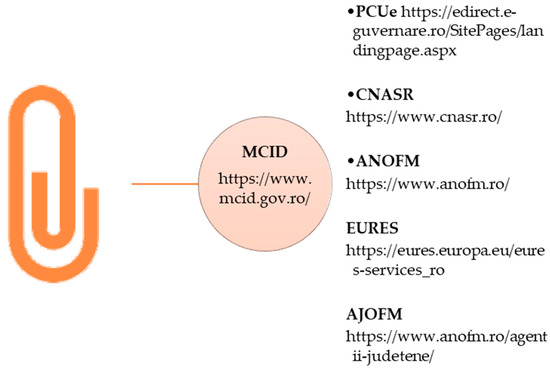 Links from the MCID [24] innovation site with non-academic digital agencies and social protection services (proper design). Websites references: CNASR. Colegiul National al Asistențiolor Sociali din România—National College of Social Workers of Romania. Available online: https://www.cnasr.ro/ (accessed on 7 March 2025) [18]. MCID. Ministerul Cercetării, Inovării și Digitalizării—The Authority for Digitization of Romania. Available online: https://www.mcid.gov.ro/sistemul-de-cercetare/descriere/ (accessed on 7 March 2025) [24]. PCU. Punctul de Contact Unic Electronic—Single Point of Contact. https://edirect.e-guvernare.ro/SitePages/landingpage.aspx (accessed on 7 March 2025) [36]. ANOFM. Agenția Națională de Ocupare a Forței de Muncă—National Employment Agency. Available online: https://www.anofm.ro/# (accessed on 7 March 2025) [35]. EURES. European Employment Services. Available online: https://eures.europa.eu/eures-services_ro (accessed on 7 March 2025) [37]. AJOFM. Agentia Judeteana de Ocupare a Fortei de Munca—County Employment Agencies. Available online: https://www.anofm.ro/agentii-judetene/ (accessed on 7 March 2025) [38].
