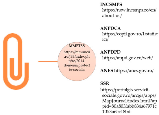 Extensions of the national MMFTSS site [28] (proper design). Websites references: MMFTSS. Ministerul Muncii, Familiei, Tineretului și Solidarității Sociale—Ministry of Labour, Family, Youth and Social Soli-darity. Available online: https://mmuncii.ro/j33/index.php/ro/2014-domenii/protectie-sociala (accessed on 7 March 2025) [28]. INCSMPS. Institutului Național de Cercetare în Domeniul Muncii și Protecției Sociale—National Institute for Scientific Research in the Field of Labour and Social Protection. Available online: https://new.incsmps.ro/en/about-us/ (accessed on 7 March 2025) [30]. ANPDCA. Autoritatea Naționale Pentru Protecția Drepturilor Copilului și Adopție—National Authority for the Protection of Children’s Rights and Adoption. Available online: https://copii.gov.ro/1/statistici/ (accessed on 7 March 2025) [31]. ANPDPD. Autoritatea Nationala de Protectie al Derepturilor Persoanlor cu Disabilitate—National Authority for the Protection of the Rights of Persons with Disabilities. Available online: https://anpd.gov.ro/web/ (accessed on 7 March 2025) [32]. ANES. Agenția Națională Pentru Egalitate de Șanse între Femei și Bărbați—National Agency for Equal Opportunities Between Women and Men. Available online: https://anes.gov.ro/ (accessed on 7 March 2025) [33].
