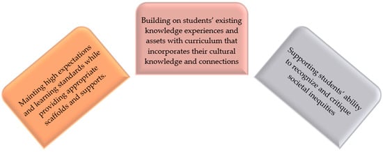 Ladson-Billings [27] asserts that all learners, regardless of personal attributes or backgrounds, should be given opportunities to be academically successful, culturally competent, and critically conscious. They further identify the three central tenets of CRT as: 1. maintaining high expectations and learning standards while providing appropriate scaffolds and learner support; 2. building on students’ existing knowledge, experiences, and assets by implementing curriculum that incorporates their cultural knowledge and connections; and 3. supporting students’ ability to recognize and critique societal inequalities. These tenets are represented in Figure 1.