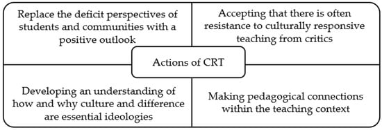 Gay [28] explains there are four actions to culturally responsive teaching. These include (1) replacing the deficit perspectives of students and communities with a positive outlook; (2) accepting that there is often resistance to culturally responsive teaching from critics; (3) developing an understanding of how and why culture and difference are essential ideologies for culturally responsive teaching; and (4) making pedagogical connections within the teaching context. These actions are represented in Figure 2.