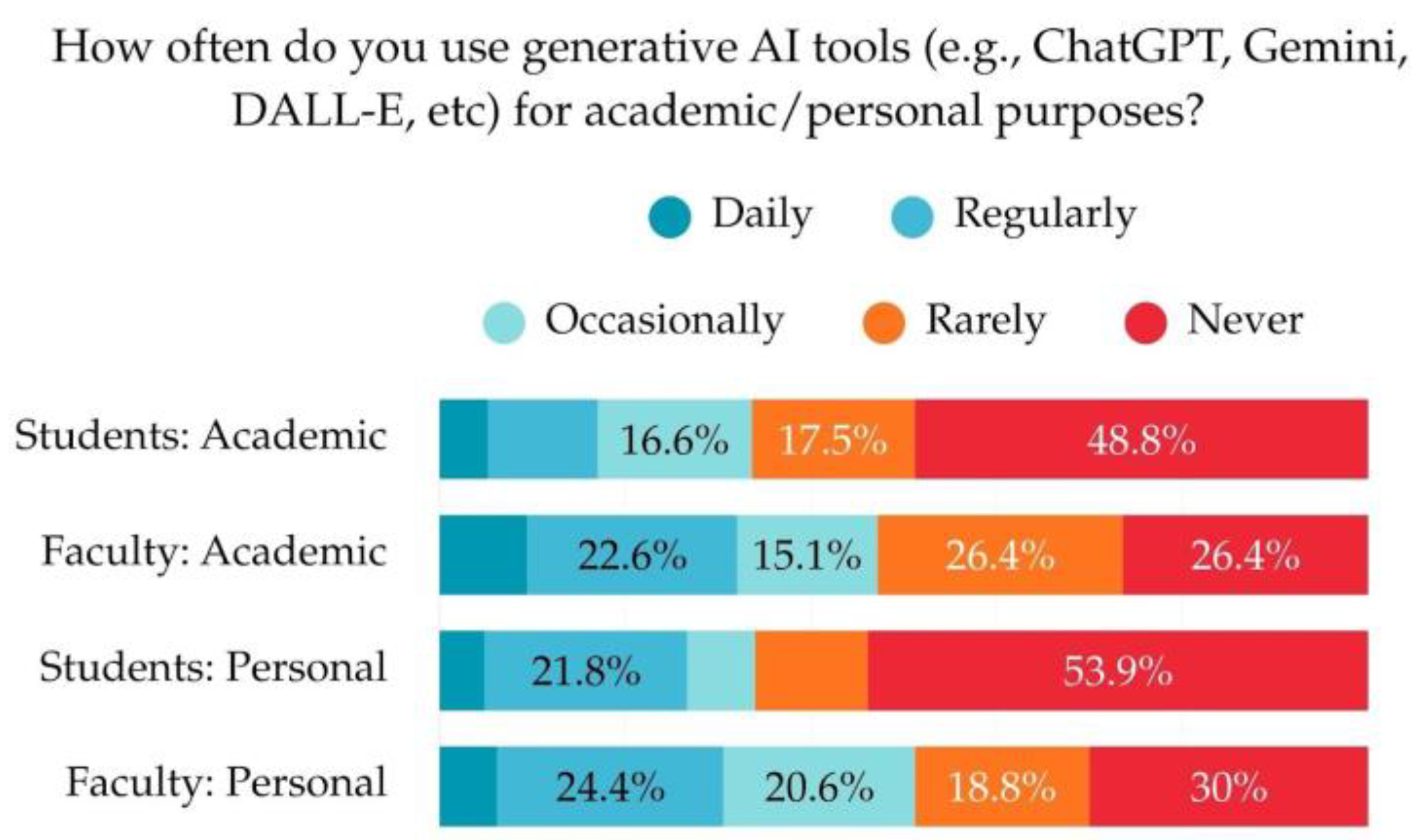 - Almisad, B.; Aleidan, A. Faculty perspectives on generative artificial intelligence: Insights into awareness, benefits, concerns, and uses. Front. Educ. 2025, 10, 1632742. [Google Scholar] [CrossRef]