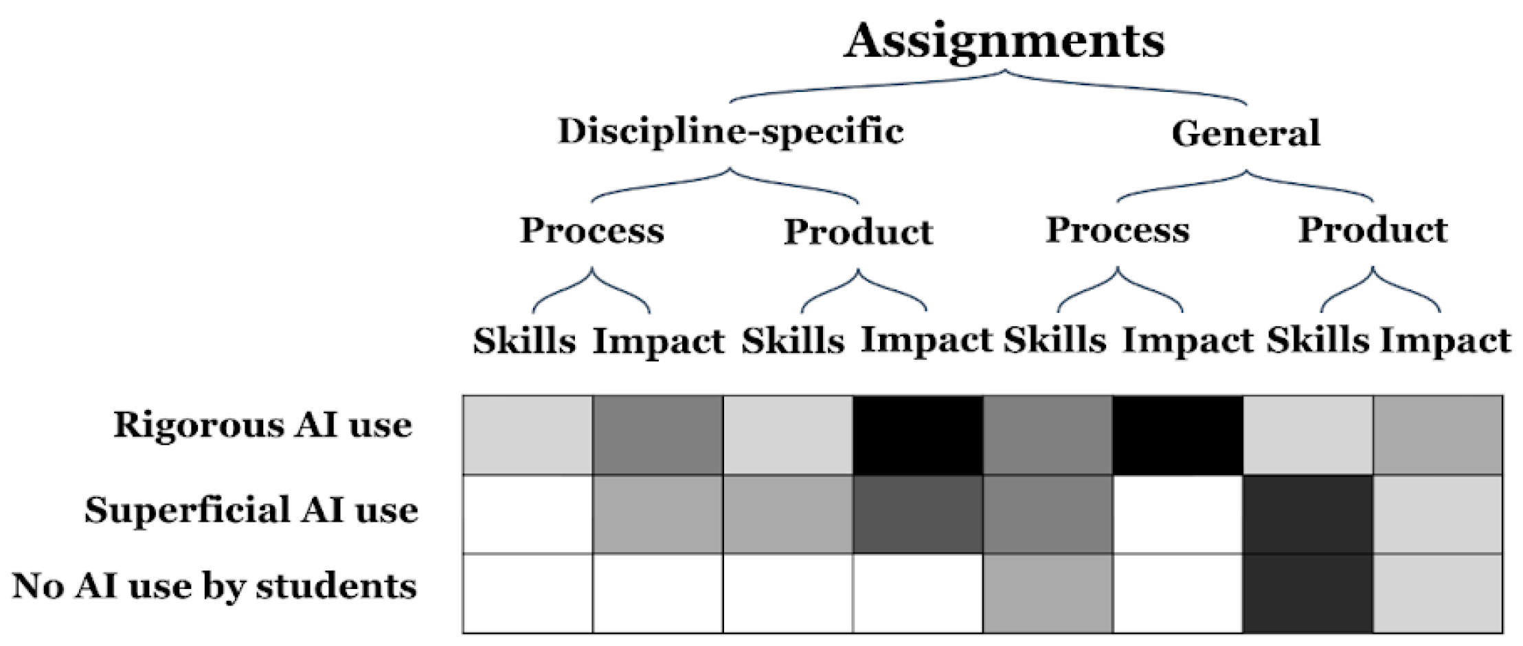 | Nature of GenAI Integration | GenAI exclusively is an object of study, not a tool | GenAI use is supplemental | GenAI collaboration is required for a part of the project | AI collaboration is at the core of the assignment |