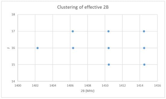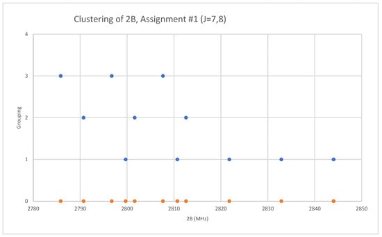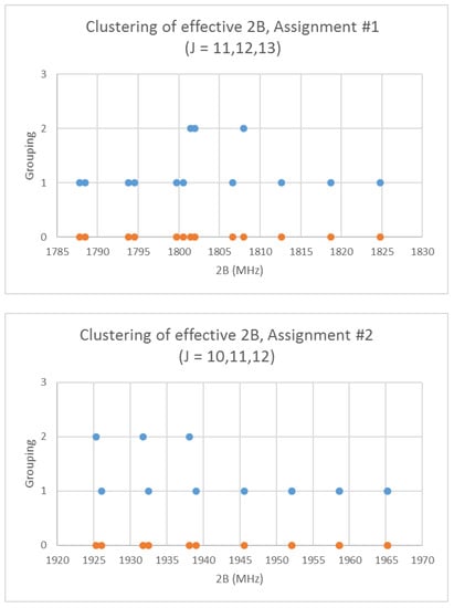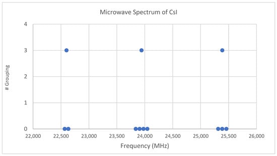 Both cesium and iodine are monoisotopic, so complications from multiple isotopologues are avoided. The predicted value of 2B from the electron diffraction value is 1340 MHz (see Supplementary Material, Excel file CsI.xlsx). The spectrum of cesium iodide in the region 22–26 GHz was measured [31] at 640 °C, and the frequencies observed (error 0.1 MHz) are given in Figure 1. Inspection of the nine frequencies (n = 9) demonstrates that there appear to be three major groupings (clusters) of frequencies. One-dimensional cluster analysis has recently been applied by the author to confirm this [32]. This tells us that the primary variation in the spectra is due to three distinct values of an independent variable, which we identify as J.