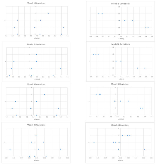 Returning to Figure 2, it is now clear that the four clusters represent different vibrational states, and we assign them to , with the highest frequency corresponding to . We may either model the effective rotational constants via Equation (37), or model the rotation spectra itself using Model 1: