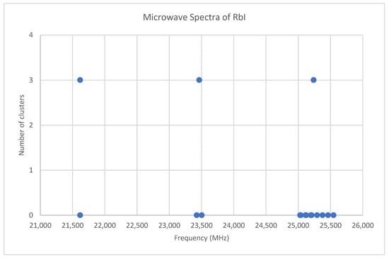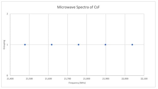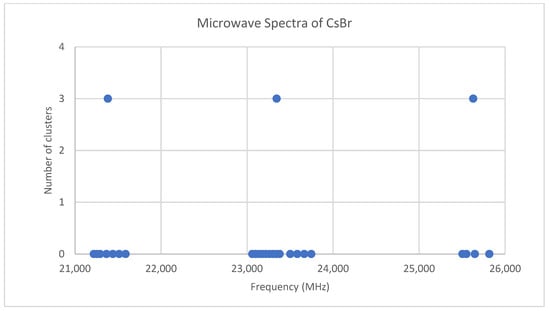 Bromine has two isotopes in approximately a 1:1 ratio, so two isotopologues should be observable in natural samples. The predicted value of 2B from the electron diffraction value is 2100 MHz (see Supplementary Material, Excel file CsBr.xlsx). The spectrum of cesium bromide in the region 21–26 GHz was measured [31] at 690 °C, and the frequencies observed (error 0.1–0.2 MHz) are given in Figure 4. Inspection of the 24 frequencies demonstrates that there are three clusters of frequencies centered at 21,382, 23,334, and 25,630 MHz [32]. The average difference of these is 2124 ± 150 MHz. The highest frequency per cluster differences is 2113 ± 45 MHz. These all suggest transitions corresponding to J = 9, 10, and 11.