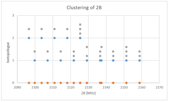 The effective rotational constants (×2) of cesium bromide. Different J values are offset by 0.2 units. The orange points are the original spectrum, the blue points are separation into isotopologues.