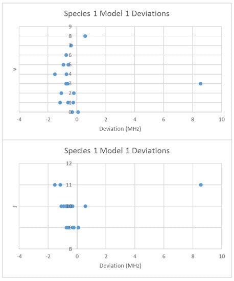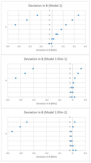 When the effective rotational constants (×2) are plotted (Figure 5), it can be seen that they naturally divide themselves into two series of equally spaced progressions, with the exception of a point at 2137.4 MHz corresponding to the observed frequency at 25,648.95 MHz. Fitting of these to Equation (37) gives Be values of 1081.27 and 1064.51 MHz. This was performed by fitting the data to both isotopologues and choosing the smaller of the two sum-of-squared errors. The deviation in 2B for the “wrong” isotopologue is an approximately constant 33 MHz. This procedure also enables separation by isotopologue. The isotopologue mass ratio is 1.015736, and the Be ratio is 1.015744, an agreement to five significant figures. This is strong evidence that the higher frequency progression (Isotopologue 1) is 133Cs79Br, and the lower frequency progression (Isotopologue 2) is 133Cs81Br. We can analyze these progressions separately. Using Model 1, the residual error for 133Cs79Br is plotted in Figure 6. The “bad” point corresponds to v = 3, J = 11. While a Q-test on the residuals can be used to exclude this point, it is important to note that this point appears to be 10 MHz too high. We suspect that this is a printing error, and that this value should actually be 25,638.95 MHz instead of 25,648.95 MHz. We will use this value henceforth as it reduces the SSE 20-fold. The results of fitting to all four models are given in Table 3. In all cases, the Be ratio matches the expected isotopic mass ratio by five significant figures. For Model 4, the re values for the two isotopologues, 3.072274 and 3.072287 Å, are in excellent agreement.
