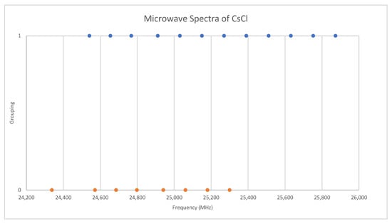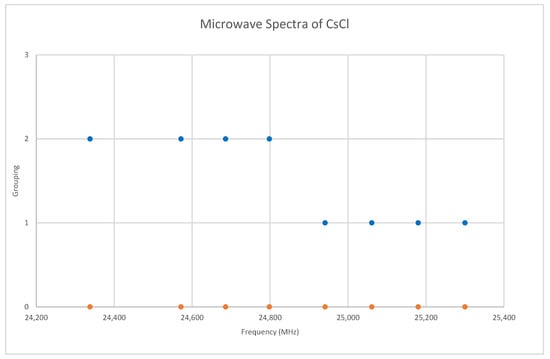 Chlorine has two isotopes in approximately a 3:1 ratio, so two isotopologues should be observable in natural samples. The predicted value of 2B from the electron diffraction value is 4000 MHz (See Supplementary Materials, Excel file CsCl.xlsx). The spectrum of cesium chloride in the region 24.3–25.4 GHz was measured [38] at 715 °C, and the frequencies observed (error 1.5 MHz) are given in Figure 7. Inspection of the eight frequencies demonstrates that there appears to be just one major grouping of frequencies. The estimated value of 2B suggests transitions corresponding to J = 5. There are two apparent gaps at about 24,450 and 24,880 MHz, which appear to be due to a missing transition and a break between two vibrational progressions, respectively. We note that because we do not have multiple values of J, there is no way to estimate the centrifugal distortion constant. We also note that the error in each measurement is fairly large compared to the previous two cesium salts analyzed.