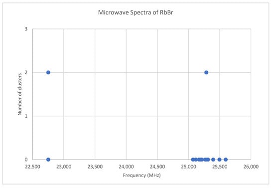 Because both rubidium and bromine are diisotopic, there may be a total of four isotopologues that could be observed. The predicted value of 2B from electron diffraction is 2650 MHz (see Supplementary Materials, Excel file RbBr.xlsx). The spectrum of rubidium bromide in the region 22.5–26.0 GHz was measured [31] at 730 °C, and the frequencies observed (error 0.1 MHz) are given in Figure 13. Inspection of the 12 frequencies demonstrates that there appear to be two major groupings (clusters) of frequencies, a single frequency at 22,752.29 MHz and a cluster centered at 25,285.29 MHz. The cluster difference is 2533 MHz, but the highest frequency components differ by 2843.70 MHz. Using the estimated 2B suggests either J = 7,8 or J = 8,9. Using the cluster average would suggest J = 8,9, whereas using the highest frequency differences (assuming v = 0) would suggest J = 7,8. With the highest frequency differences usually being more accurate, and along with the 2B clustering favoring this as well, we assign these to J = 7,8, with three different vibrational progressions (Figure 14).