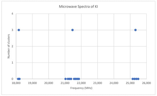 Potassium has two isotopes, 39K and 41K, present in approximately a 14:1 ratio. The predicted value of 2B from electron diffraction is 3300 MHz (see Supplementary Materials, Excel file KI.xlsx). The spectrum of potassium iodide in the region 18–26 GHz was measured [31] at 690 °C, and the frequencies observed (error 0.1–0.3 MHz) are given in Figure 15. Inspection of the 14 frequencies demonstrates that there appears to be three major groupings (clusters) of frequencies. Analysis of this spectrum is left for the reader as a more challenging exercise (Appendix B). The results for 39K127I are Model 1, Be = 1824.840, αe = 7.941 MHz; Model 2, Be = 1824.962, αe = 8.047, γe = −0.0141 MHz; Model 3, Be = 1825.023, αe = 7.944, De = 0.0022 MHz; Model 4, Be = 1825.059, αe = 8.040, γe = −0.0130, De = 0.0013 MHz. The value of re is calculated as 3.047776 Å. The value of r0 for the heavier isotopologue 41K127I can be calculated as 3.051148 Å.