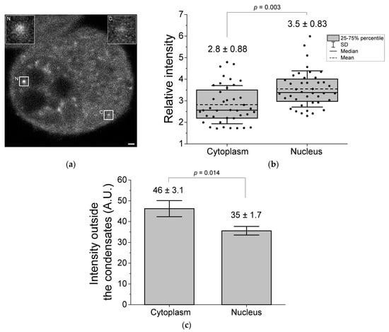 Fluorescence intensity in and out of the CRY2R condensate region was manually measured using Fiji-ImageJ (https://fiji.sc/, accessed on 7 July 2023). The mean intensities in CRY2R condensates in the cytoplasm and nucleus were normalized to those in the nucleoplasm or cytoplasmic region that did not include the condensates.