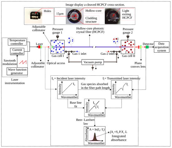 Schematic arrangement of the two-bulb (TB) diffusion configuration with a hollow-core photonic crystal fiber (HCPCF). The schematic shows a typical direct absorption measurement using the tunable diode laser absorption spectroscopy (TDLAS) technique, shown for a single sawtooth modulation of the laser diode current [41]. Figure is not drawn to scale, and the size of gas particles is exaggerated.