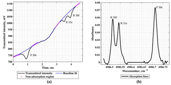 - Krishna, Y.; O’Byrne, S.; Kurtz, J. Baseline correction for stray light in log-ratio diode laser absorption measurements. Appl. Opt. 2014, 53, 4128–4135. [Google Scholar] [CrossRef]