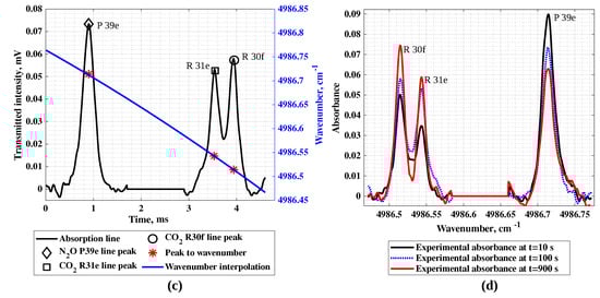 (a) Non-absorption regions surrounding two absorption lines selected for the baseline fit interpolation. The rotational transitions are P39e for N2O and R31e and R30f for CO2. (b) CO2 and N2O absorbance spectrum. (c) Wavenumber interpolation using absorption line peaks. (d) Change in absorbance spectrum during diffusion process shown at different times t = 10 s, 100 s and 900 s.