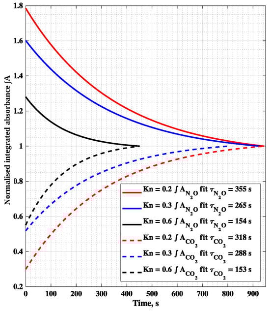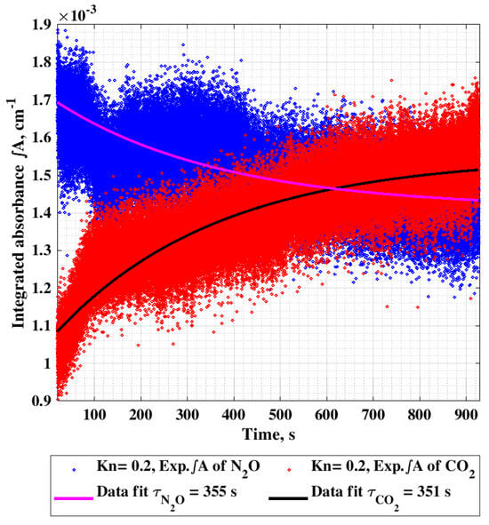 The results of a sample data analysis from a single experimental run where Kn = 0.2 are presented here. The non-absorption region of the spectra and the baseline interpolation are shown in Figure 2a, and the corresponding absorbance is shown in Figure 2b. The conversion from time scale to wavenumber scale was obtained using the absorption line peaks of known wavenumber from the (https://HITRAN.org/) HITRAN database as shown in Figure 2c. Here, linear interpolation is assumed between time and wavenumber since a sawtooth modulation of the laser diode current generates a linear variation in laser wavelength. The comparison of the absorbance spectrum profiles at different times shows the variation in the absorbance due to diffusion and is shown in Figure 2d. Note that the increase in absorbance with time for two spectral lines of CO2 will vary for the same mole fraction of CO2, according to the strength of the absorption line presented in Table 1. The increase in the integrated absorbance of CO2 (∫ACO2) and the decrease in the integrated absorbance of N2O (∫AN2O) were monitored simultaneously throughout the experiment. Here, the integrated absorbance of CO2 (∫ACO2) is the result of the integrated absorbance of two peaks at 4986.51 cm and 4986.54 cm of CO2 together. The reason for not splitting or decoupling the absorption profiles of two peaks is to avoid the increase in uncertainty of the integrated absorbance ∫A measurement of a single absorption line or peak when the two peaks are overlapping. This procedure will not affect the diffusion coefficient measurement since the measurement of time constant is independent of the absolute value of the integrated absorbance ∫A. This is one of the advantages of the technique—measure a time constant for the change in absorption rather than the absolute change of absorption. A least-squares error fit of ∫ACO2 and ∫AN2O has been obtained using the Levenberg-Marquardt nonlinear curve fitting algorithm, and from the fit, the time constants CO2 and N2O of the experimental data have been evaluated as shown in Figure 3. Although the background fitting uncertainty of the absorption lines reduces the signal-to-noise ratio, the time constants CO2 and N2O are measurable. The normalised fit of the experimental ∫A data—one experimental run from each Knudsen number—is shown in Figure 4. As expected, increasing the Knudsen number increases the diffusion rate of CO2 and N2O gases to reach the steady state condition. Table 2 shows the summary of the measured Deff-N2O and Deff-CO2 values for the CO2-N2O gas mixture in the transition gas regime at a few Knudsen numbers Kn = 0.2, 0.3 and 0.6. As expected, the measured Deff-N2O and Deff-CO2 values increase with increasing Knudsen numbers. The standard uncertainty in the measured mean value of the diffusion coefficient for the CO2-N2O gas pair is less than ±3.6 %. The Deff values that cannot be deduced from the experimental data due to poor signal are marked with a symbol ♠ in that table. In those particular experimental runs, the integrated absorbance ∫A data has more fluctuations due to baseline fit uncertainty and possible etalon effect around the spectral lines, which causes a variation of more than 20% in the time constant values between CO2 and N2O. Thus, those experimental runs having a low signal-to-noise measurements are discarded from Table 2.