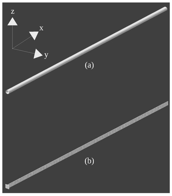 The collision cell or grid cell sizes x, y, and z are chosen to be one-third of the local mean free path () of a gas species [70]. The grid cell sizes are chosen equal i.e., x = y = z due to equal probability of particle movement in any of the x, y, and z directions. In the simulation, x represents the gas diffusion direction along the length of the fiber, and the y and z are perpendicular directions to the length of the fiber. The number of grid cells in x-direction (Nx) is calculated as the ratio of the fiber length L1 to x. The number of grid cells in y (Ny) and z (Nz) directions is calculated as the ratio of the fiber diameter (df) to y and z, respectively. A three-dimensional grid mesh Nx × Ny × Nz is used to calculate the number of simulation particles per collision cell. SPARTA uses a grid mesh in Cartesian coordinates, which is followed in this work. A circular cross-section or cylindrical surface is embedded in the simulation box to replicate the experimental diffusion process inside the fiber and is shown in Figure 5a. A sample mesh in the yz plane at x = 0 and in the xz plane at y = 0 is shown in Figure 5b. A collision model determines the criteria for which collisions occur and alters the velocity of participating particles as well as their rotational and vibrational energies. Hence, the calculations for and the grid cell sizes x, y, and z are based on the variable soft sphere (VSS) collision model parameters recommended for the Monte Carlo simulation [72]. The VSS collision model is considered an appropriate model for molecular diffusion problems in gas mixture flows [73,74] since the deflection angle containing the exponent or angular-scattering parameter, which relates the scattering angle to the impact parameter, strongly influences the momentum or diffusion coefficient as discussed in reference [23]. The VSS model parameters for CO2 and N2O species are given in reference [23], and the molecular and cross-collisions parameters of the VSS model are implemented in the SPARTA DSMC code.