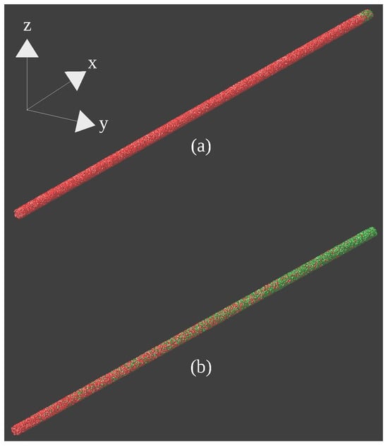 Gas 1 is filled inside the VRC1 + Vfib reservoir cell 1 and the fiber, and gas 2 is filled inside the VRC2 reservoir cell 2 for initiation of diffusion. The Nsim values of gas 1 and gas 2 species are generated based on the number density. A constant mass flux of gas species corresponding to pressure and temperature conditions in reservoir cells is sufficient to feed or diffuse into the fiber constantly. The boundary condition is provided such that gas 1 entering the reservoir cell 2 (RC2) boundary vanishes, and similarly gas 2 entering the reservoir cell 1 (RC1) boundary vanishes from the simulation. This is because the reservoir cells contain a large concentration of the species that they were initially filled with, and the relatively small numbers of diffusing particles of the other species entering the reservoir will make up a negligible fraction of the cell concentration and hence can be ignored in the simulation. Table 3 lists the values of x, y, z, t calculated for the simulation length L1, number density of physical particles (n = Nphysical/Vsim) for simulation volume Vsim, and Nsim calculated for Fnum = 1 × 104 of a CO2-N2O gas mixture at Kn = 0.6. The value of Fnum is kept as high as 1 × 104, that is 1 simulation particle per 10,000 real particles, such that there are approximately 5 simulation particles per collision cell to ensure sufficient binary collisions in the DSMC simulation. A sample of initial and final states of the DSMC simulation of CO2-N2O gas mixture diffusion for length L1 at Kn = 0.6 is shown in Figure 6a and Figure 6b respectively. The red spots represent the N2O particles while the green spots represent the CO2 particles.