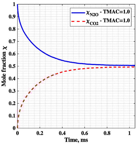 Change in DSMC computed mole fractions of and with time of CO2-N2O gas mixture diffusion at Kn = 0.6 for TMAC = 1.0.