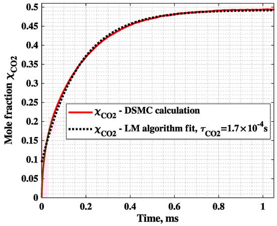 The results of three-dimensional DSMC calculations of a CO2-N2O gas mixture at Kn = 0.6 for TMAC values of 0.0, 0.8, 0.9, and 1.0 are shown as cases (a), (b), (c), and (d) respectively in Table 4. A sample DSMC simulation run of a CO2-N2O gas mixture for TMAC = 1.0 showing change in mole fractions and with time is shown in Figure 7. The corresponding nonlinear least-squares error fit of the change in mole fraction has been obtained using the Levenberg-Marquardt algorithm as shown in Figure 8. Subsequently, the time constant CO2 of the DSMC simulation has been evaluated from the fit, and the diffusion coefficient Deff of the CO2-N2O gas mixture diffusion has been calculated. DSMC simulation at the highest value of TMAC = 1.0 accounting for the fully diffuse reflection of a particle with a wall surface predicts that the diffusion of CO2 and N2O particles is slowed down. Hence, the DSMC calculated Deff for the case of TMAC = 1.0 is lower by 7 % compared with TMAC of 0.8 and by 27 % compared with TMAC of 0.0 for fully specular wall reflection, as shown in Table 4. DSMC calculations for each TMAC condition have been carried out three times with different random number generators for a statistically-independent simulation in SPARTA DSMC code. Thus, results presented in Table 4 are the average Deff of three DSMC simulation runs. The range of Deff values produced by the different simulations are within ±0.2 cm2s−1.
