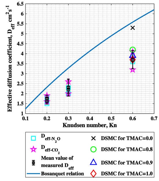 The ability of simultaneous measurement of Deff of multiple species opens up the possibility to determine whether the diffusion process is concentration dependent or independent in a multicomponent gas mixture. Since a multicomponent gas mixture diffusion exhibits a coupled influence of concentration between multiple species, various mole fractions () of multiple species may affect the diffusion coefficient value of a particular species. This is relevant in the continuum gas regime where the P-t-P collisions dominate in the diffusion coefficient measurement [55,56]. Whether the same effect is applicable or not in the transition gas regime at 0.1 < Kn ≤ 10, where P-t-W and P-t-P collision frequencies are comparable, can be checked upon with simultaneous Deff measurement as demonstrated in this paper. For a two-component gas mixture, the Deff value is concentration independent if both species Deff-1 and Deff-2 values are equal even if diffusion starts from different mole fraction ratios :. Any combination of initial mole fraction mixtures, for example, : = 0.7:0.3, could have been considered, although : = 1:0 is the most straightforward starting point to demonstrate in this work. The measured Deff-N2O and Deff-CO2 values are similar for each Knudsen number case (Kn = 0.2, 0.3 and 0.6 listed in Table 2). Hence, the Deff of the CO2-N2O gas mixture has been observed as independent of gas mixture concentration to within our measurement uncertainty for an initial molar mixture of : = 1:0. The observation seems valid since both CO2 and N2O have an equal molecular mass of 44.01 g/mol and kinetic diameter of 330 pm, hence, the gas mixture may act as an equivalent self-diffusion process provided both gas species do not have different wall surface collision behaviour. However, more Deff measurements are required for various initial mole fractions to conclusively demonstrate concentration independent diffusion of CO2-N2O in the transition gas regime.
