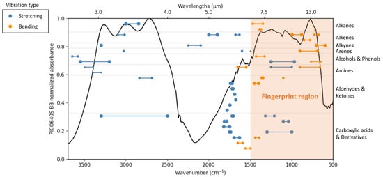 Organic compounds exhibit numerous spectral features in the Mid-IR range that align nicely with the sensitivity ranges of our 3–14 µm BB micro-bolometer. This band largely encompasses the ‘fingerprint region’: commonly defined as the 1500–500 cm−1 range, and characterized by highly distinctive absorption patterns. Capturing their spectrum over this broad spectral band yields high confidence in compound identification, including blends and additives.