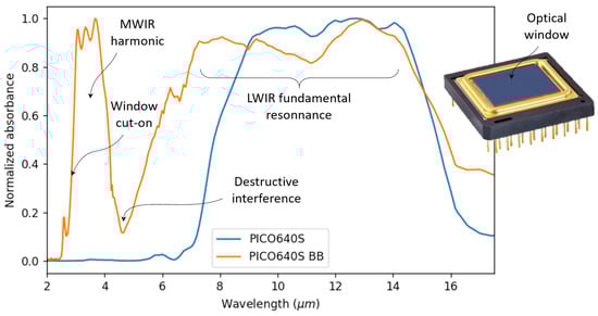 Normalized spectral absorbance of the 17 µm VOx micro-bolomter with a standard LWIR window (PICO640S) and with the BB window (PICO640S BB), measured with a FTIR.