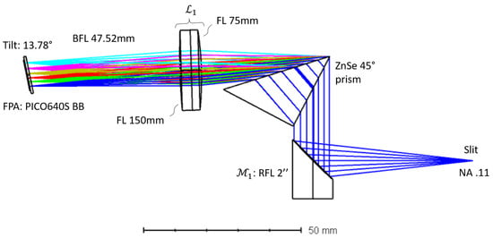 This wavelength-dependent angular dispersion is projected onto the FPA using the lens group : a combination of two ZnSe spherical plano-convex lenses (1′′ diameter, FL 75 mm and 150 mm, LA7028-E4 and LA7660-E4 from Thorlabs) with a 3–14 µm BB anti-reflection coating. We account for the chromatic longitudinal shift of this lens group through a 13.78° tilt of the FPA.