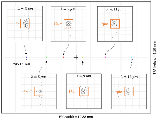 We show in Figure 4, the spot diagram, which gives the geometrical spreading of the optical spot on the FPA (represented by the black frame), sampled on six spectral components from 3 µm to 13 µm. We verify that the spots, associated with the sampled wavelengths, are properly aligned with a line on the FPA, = 450 pixels wide.