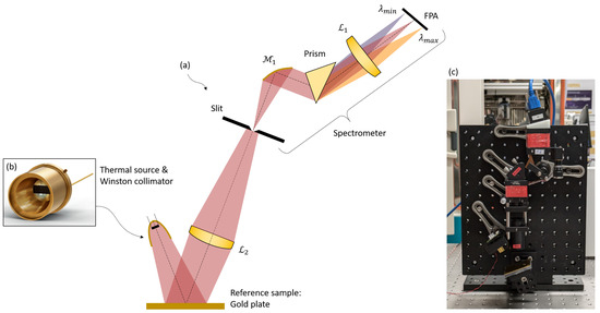 The rest of the system consists of the illumination block (radiative element and Winston cone collimator), which provides the beam to interact with a sample on the sample holder, and then projects the beam onto the slit using lens (, FL 50 mm, LA7656-E4 from Thorlabs) using a 2f/2f setup that conjugates the radiative element and the slit. The sample holder is simply a gold plate that acts as the reference sample, assumed 100% reflective.