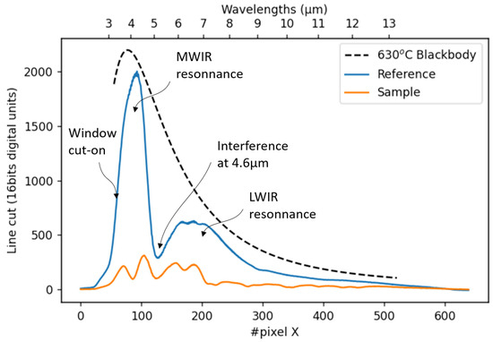 Line-cut of the reference sample image and the PP sample image, compared with the 630 °C blackbody luminance curve (operating temperature of the thermal source).