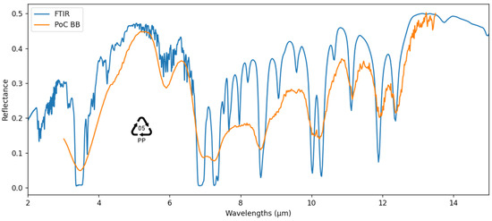 We compare the performances of our PoC spectrometer against a commercial laboratory FTIR instrument (IRTF Vertex 70 from Bruker, Billerica, MA, USA) on the same PP sample (see, Figure 8). The interaction modes are as close as possible: specular reflectance with an incidence angle of 13°.