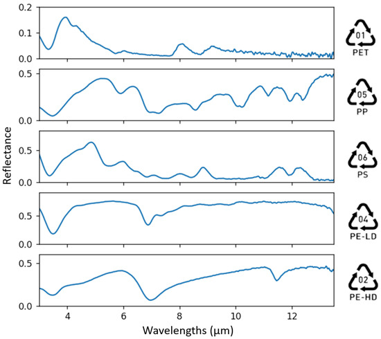 Example spectra from five different plastics: PET, PP, PS, PE-LD and PE-HD.